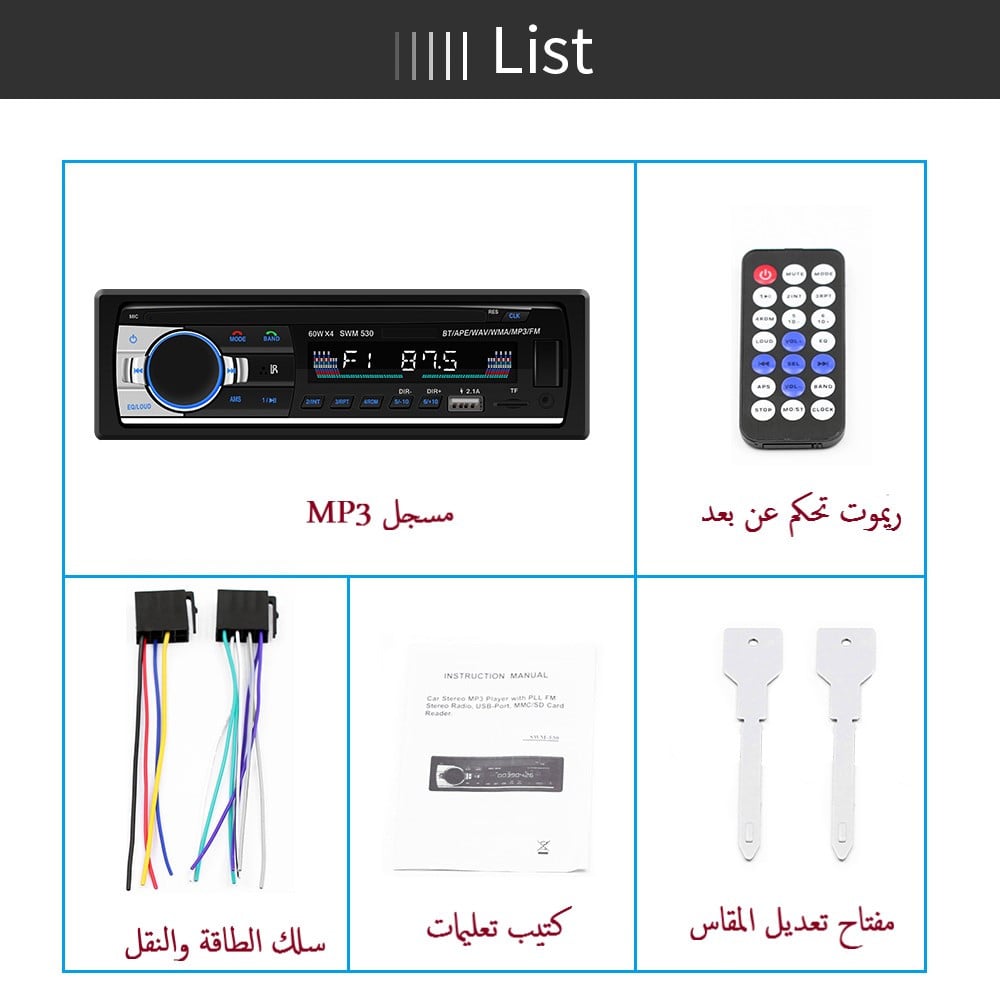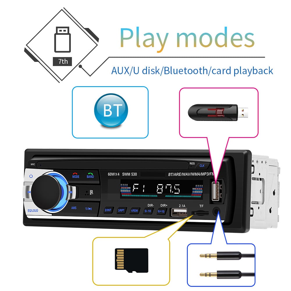 الجهاز يضم جهاز البلوتوث و شاحن جوال ومنفذ USB ومنفذ AUX ومنفذ ذاكرة خارجية وراديو FM وريموت تحكم عن بعد والرد على المكالمات , والكثير من المميزات الأخرى التي سوف نوضحها بالتفصيل فيما يلي: